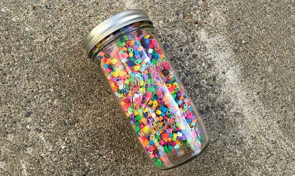 It’s time to start filling the jar with beads and layering the findings. Carefully pour in your first scoop of Perler beads along with a few toys.