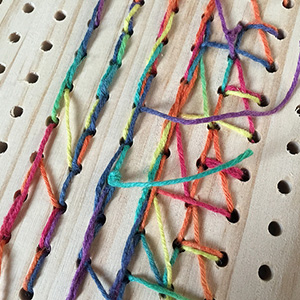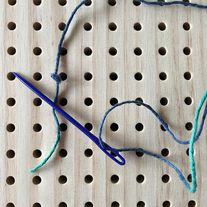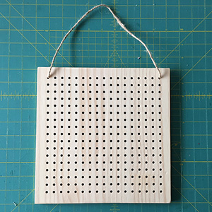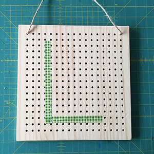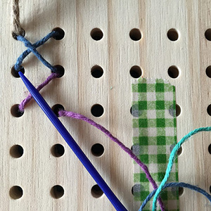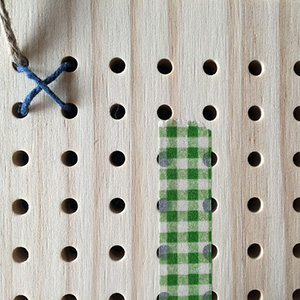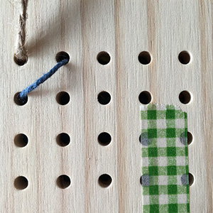 Let’s cross stitch! Insert the plastic needle into a hole from the back of the board and pull the cord through to front. Insert the needle again diagonally to create the first part of the cross.