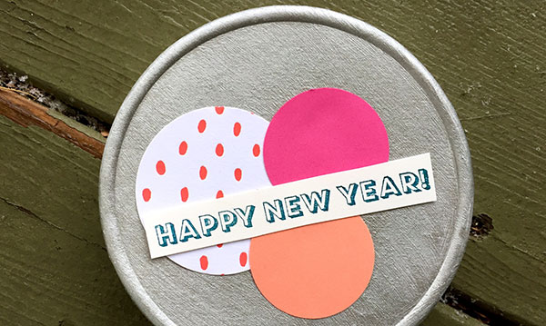 With your noisemaker full, it’s time to decorate it! These paper scraps were punched into a few different sizes to create polka dots on our noisemaker. Add a festive New Year’s stamp to make it official for your party needs later this month!