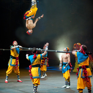 Demonstrating Herculean strength, the Mongolian strongman duo Titanic Tulga and Mighty Meetal lift half-ton telephone poles and twirl them above their heads, while limber acrobats balance atop.