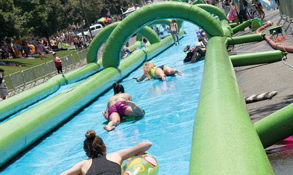 Be sure to wear a swimsuit or “tasteful” clothing (it’s a family-friendly event!); no jeans/rivets allowed. Don’t forget sunscreen, water buckets, floaties, water guns and inner tubes – all visitors must ride the slide on a tube, which is only included with triple/unlimited tickets. Sliders must be at least 46 inches tall and 5 years old.