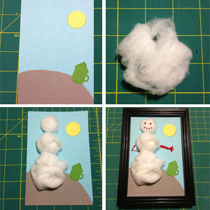 | 5. With the other half of the cotton ball you pulled apart, remove an additional amount of cotton so the snowman’s head is the smallest snowball. Glue to the top of the snowman.