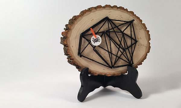 Working with your ball of black yarn, tie a double knot to one of the nails you added. Wrapping the yarn around each nail twice and pushing the yarn down onto the plaque, slowly work your way around the outside of the web shape, pulling the yarn a bit tight as you go, and then start crossing across the web to create a unique design.