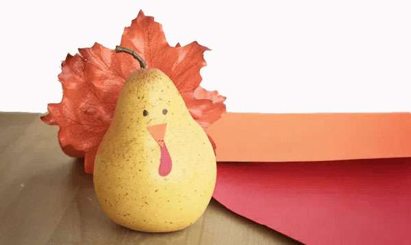It’s OK to play with your food this week! Shrimp Salad Circus shows you how your children can turn a plain pear into a cute Thanksgiving turkey.