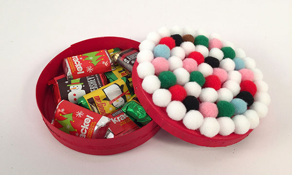 With the glue dried and pompoms in place, you can fill the container with your gift of choice. Think about adding chocolates or even a small toy to share with a family member or friend!