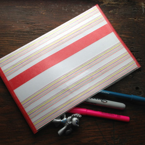 | 6. Add a piece of solid washi tape to either side of the pouch to secure. Trim the excess. Cut two small pieces of Con-Tact paper and cover the solid washi tape you just added. |