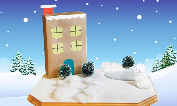 - Once the board has been decorated, the finishing touch is adding the building – or buildings, depending on the size of the village. Add to the board with a generous helping of hot glue. Apply pressure to ensure the box makes strong contact between its bottom and the board.