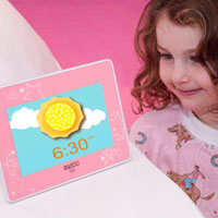 Presets make you yawn? You can easily personalize the clock by uploading pictures – one of your child awake, for example, and one of her sleeping. It’s a fun feature for your child that can tap a little creativity, too (how ’bout a konked-out kitty for night and rock-star shredding a guitar for morning?).
