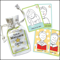 This bag of table manner tricks, which was created by mom Staci Ericson after her daughter’s sloppy eating habits were embarrassingly pointed out by another parent, includes 14 illustrated cards depicting different dinnertime behaviors.