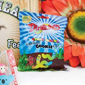 Dirtilicious Candy. The early bird gets the gummy worms and chocolate cookie crumbs! Snack from the bag or use it as a chocolate pudding topping. Ludo, $2.25.