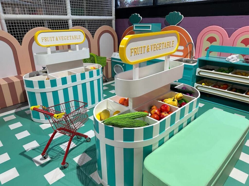There’s also plenty of space for imaginative play. T&B Play has adorable settings for playing make-believe, including a tiny grocery store and a dress-up area.