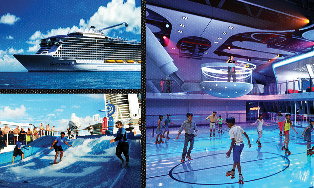 On Royal Caribbean’s Oasis or Allure of the Seas, from bow to stern, port to starboard (that’s front to back, left to right for landlubbers), there are unique places to explore. Thrill seekers will want to head to the stern of the ship, where they will find the Flowrider surf machines. In these wave making areas you can grab a surfboard and try mastering the waves. Other pools dot the deck. Stay high and dry zooming along nine decks above the ship’s Boardwalk area on a zipline or climb on one of two rock walls – all while enjoying the blue skies above you and the sea all around. The new Quantum of the Seas will feature SeaPlex, the largest indoor active space at sea that offers roller skating or bumper cars – a first at sea innovation. Of course, you’ll also find miniature golf and sports courts. And for a more laidback afternoon, grab a seat in the most transformational space at sea – Two70マ_, an open area living room which boasts beautiful panoramic views by day.