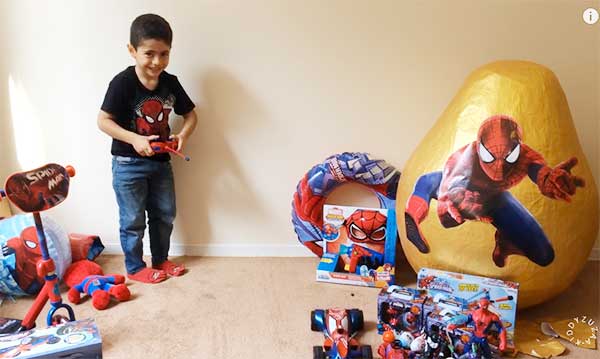 Kids love Kinder Surprise Eggs – the hollow chocolate eggs with tiny mystery toys inside, currently banned in the U.S. – so it’s easy to see why this video strikes a chord. Here you’ll watch a little boy open a giant, DIY surprise egg made of paper mache that’s filled with tons of Spider-Man toys.
