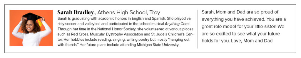 Your message will include a photo, a 75-word tribute to your senior and a 35-word personal note from you. Graduates will be listed alphabetically under their school and share a page with up to five others. Plus, we will mail two copies of the issue to the address you provide.