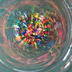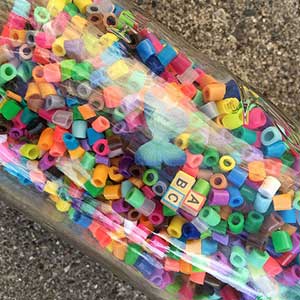 It’s time to start filling the jar with beads and layering the findings. Carefully pour in your first scoop of Perler beads along with a few toys.