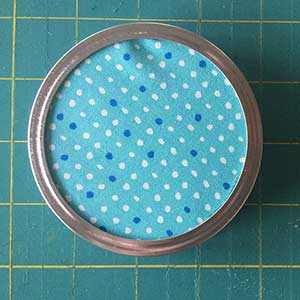 Add a line of hot glue to the inside of the metal ring and place the fabric-covered seal into it so that paper circle is on the bottom. Let cool and then screw onto the jar.